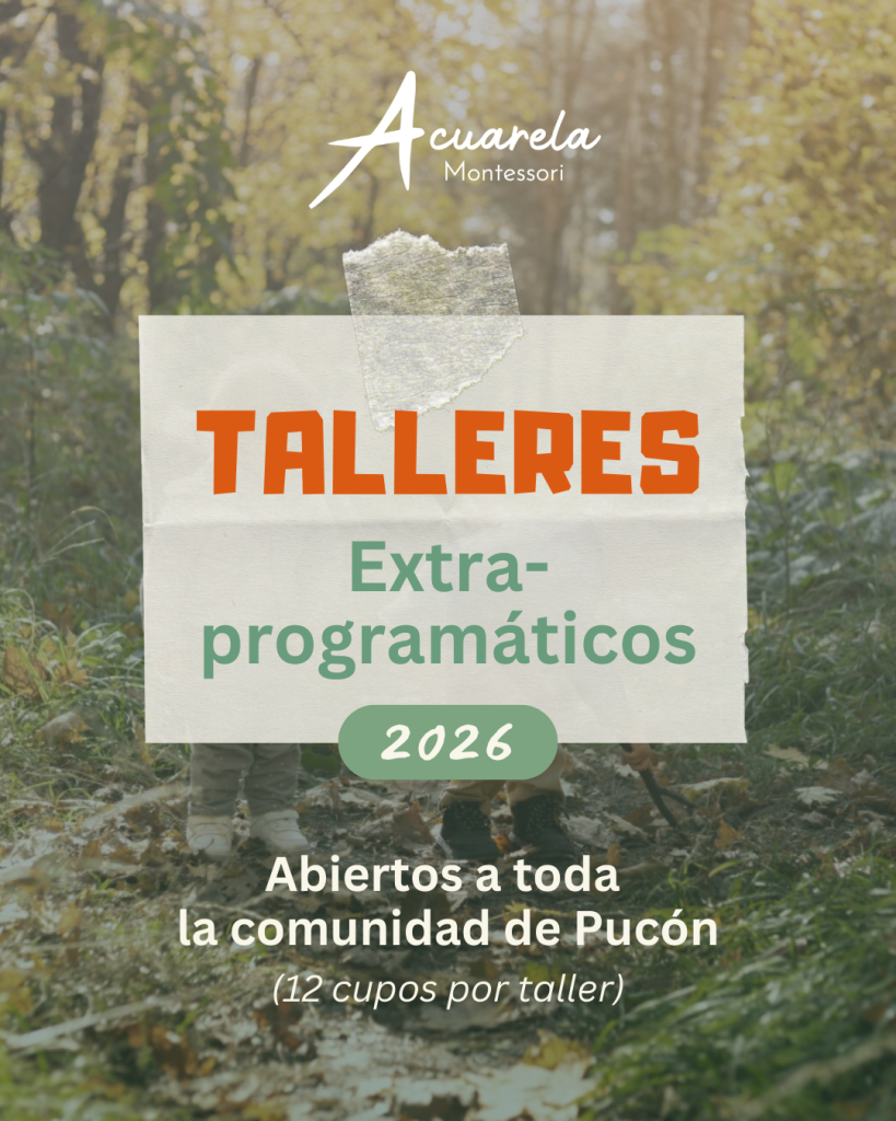 En abril comenzamos con los talleres extraprogramáticos en Acuarela Montessori, abiertos a toda la comunidad de Pucón. Cupos máximos por taller: 12 niños/as. Las inscripciones se realizan directamente con cada tallerista a los números de teléfono correspondiente.